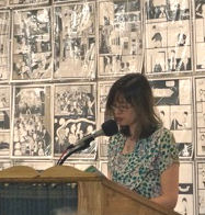 When we gathered for a photo afterwards, Kate and Gina were lost in the crowd and we couldn't pull them over, but here's most of us - framed by a wall of black and white comic book pages. When you think about reading in the Basil Hallward Gallery in the Pearl Room of the City of Books, you have to wonder what art show will serve as your backdrop. I loved this. It was nearly floor to ceiling.